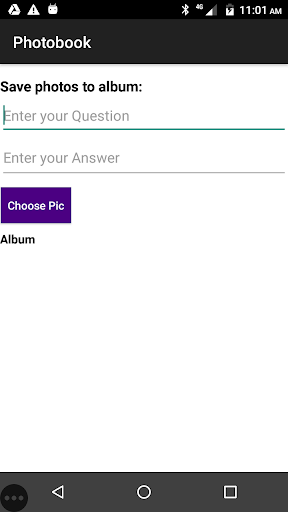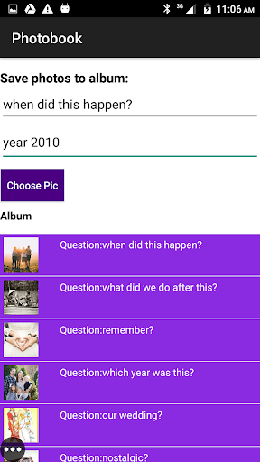 가상하면포토 북앱에서앨범을만듭니다.이를 위해 갤러리에서 사진과 함께 앨범을로드하십시오.사진 선택과 함께 질문과 답변을 입력하십시오.사진 앨범은 질문 만 표시합니다.준비가되면 앨범에서 각 사진을 누르면 사진이 새 화면에서 열리고 사진 책이 친구에게 입력 한 질문을 묻습니다. 친구가 답변 할 아이콘을 탭해야합니다.그것이 정확하다면 포토 북이 일치 할 것입니다. 그렇지 않으면 잘못된 말을하고 입력 한 답변을 제공합니다.