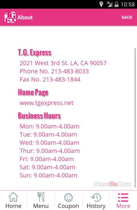 T.G. Express 's mobile application available for Android. The application is packed with many features. It enables user to place an order, view items, redeem our various coupons, provide direction, get update promotion and store order history including preference information for next purchases. It is also built from the high level of security with latest technology standard make any online transactions with us a breeze and secure. So if you are our fans or would like to try out our offering features. Grab this app and Enjoy!!