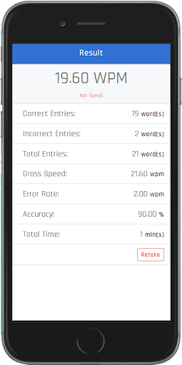 테스트의 속도와 정확도를 평가하기 위해 5 자 계산의 표준 속도 경로를 평가했습니다.한 단어와 속도가 이러한 방식으로 계산됩니다.당신은 당신의 속도가 모든 인도 정부 직무 입력 시험 속도 계산만큼 정확하다는 것을 알게 될 것입니다.이 응용 프로그램은 잘못된 항목, 분당 거대한 단어, 분당 순 단어, 정확도를 보여줍니다.우리는 우리가 당신에게 단어 훈련, 문장 연습 및이 앱 이외의 것을 제공했던 것처럼 타이핑 테스트에서 다양성을 제공하려고 노력했습니다.BR> 기능 :-