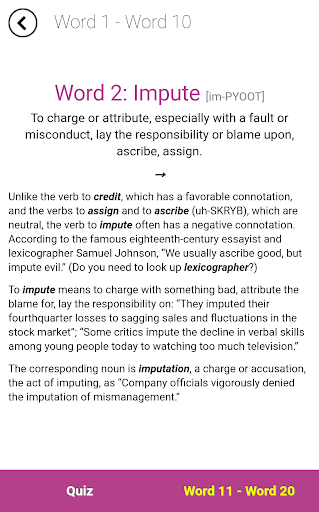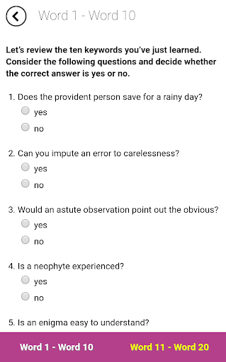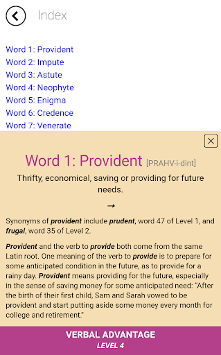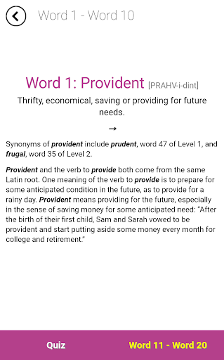 당신 10 개 레벨의 어휘를 진행하며 각 레벨은 이전 레벨보다 더 어렵습니다. 예를 들어, 레벨 1에는 성인의 약 60 ~ 70 %에게 익숙한 단어, 즉 많은 고등학교 졸업생과 대부분의 대학 졸업생에게 알려진 단어가 포함되어 있습니다. 레벨 5가 끝날 무렵, 당신은 당신의 어휘를 약 75 번째 백분위 수 (교육을받은 모든 성인의 상위 1/4)까지 올릴 것입니다. 레벨 8이 끝나면 당신의 어휘는 고급 학위를 가진 사람들을 포함하여 대부분의 임원 및 전문가의 어휘를 능가 할 것입니다. 그리고 10 번째이자 마지막 레벨을 완료하면 전체 인구의 95 % 이상으로 발전 할 것입니다. 천 명당 소수의 사람들 만이 일치 할 수있는 단어의 병기를 지휘하게됩니다.
