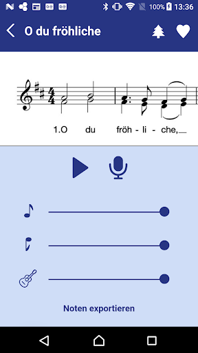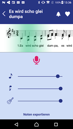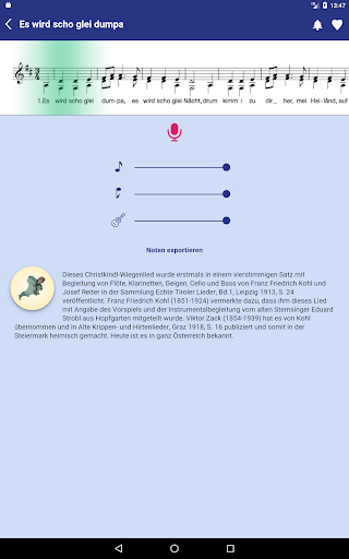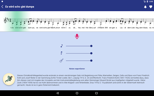 Beim Abspielen der Lieder läuft am Smartphone oder Tablet das Notenbild mit dem Text mit, um so das Erlernen des Liedes zu erleichtern. Zunächst sollte man in der App nur jene der beiden Gesangsstimmen laut lassen, die man lernen möchte. Mit dem Lautstärken-Regler kann man die andere Stimme ganz einfach leiser oder wegschalten.