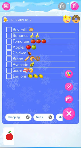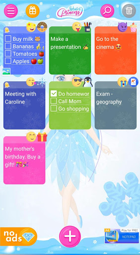 ❄ Winter Princess Notepad (with PIN or fingerprint) features two basic note taking formats, a text option, and a checklist option. Add as many as you want to your master list, which appears on the app's home screen each time the program opens.