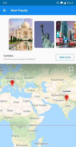 솔루션이 있습니다.집에 앉아 전 세계에서 가장 놀라운 목적지를 탐험하십시오.그것은 쉽습니다. 세계 투어 3D 앱으로 360 ° 뷰로 전 세계의 위치를 탐색 할 수 있습니다.나열된 것들에서 좋아하는 위치를 선택하고 손가락으로 스 와이프하여 360 ° 뷰를 즐기십시오.