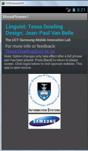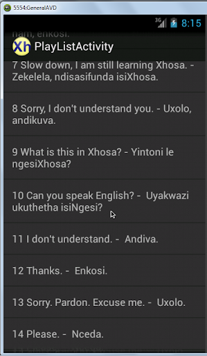 Xhosa Phrases is a simple yet useful and completely free Android app that plays about forty frequently used Xhosa (or isiXhosa) conversational phrases with their English translations on your Android phone. If you master these phrases, you should be able to delight and “click” with Xhosa speakers. The app cycles (random/sequentially) through the various phrases, and you can lengthen the pauses inbetween sentences in case you want to practice them out loud or need more time. You can switch off the English translations so that you can just listen to the Xhosa phrases playing back, if you are commuting or waiting to see the bank manager! Also options for repeat/single play; long/short pauses and random/sequential play.