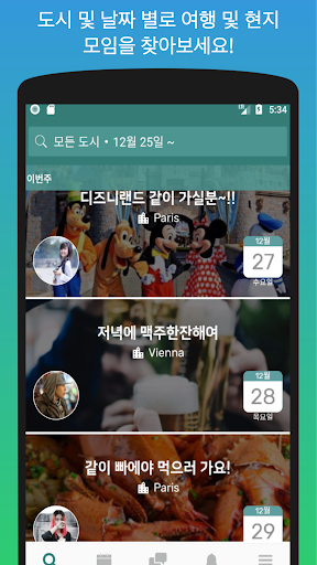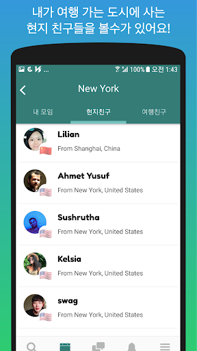 • 당신이 거주하고 있는 같은 도시에서 살고 있는 친구나 여행오는 친구들을 확인 할수 있어요! 또한 당신이 여행하는 도시에 현지친구나 비슷한 시기에 여행오는 다른 여행친구들도 확인할수 있어요!