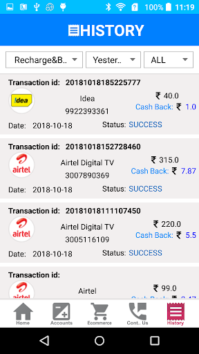 We take care of all types of recharges: Prepaid, DTH recharges, Internet Data Cards as well as postpaid bill payments of all the service providers in India. The most popular ones being Airtel, Aircel, Vodafone, Idea, Reliance, Tata Docomo, Tatasky, Sun DTH, Big TV, etc. You can also pay your electricity & gas bills for all the major operators of India.