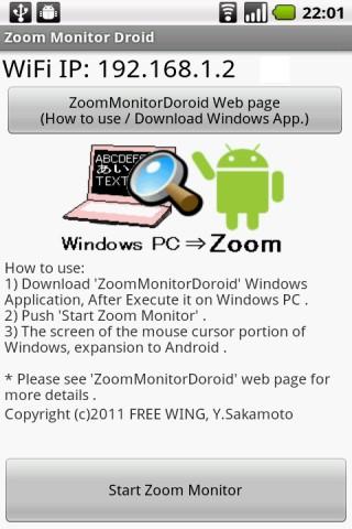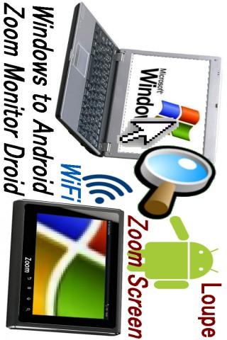 An android terminal is an expansion substitute of a Windows screen.Zoom Windows Screen DroidGoogle Nexus 7 tablet OK Zoom Monitor Droid Windows SubMonitor SubScreenZoom Monitor Droid is zoom display Windows screen, ZoomMonitorDroidAn android terminal is an expansion substitute of a Windows screen.It is disguised as a monitor. Zoom Monitor Droid WindowsPC Screen gt; Android Display Zoomed via wifi This app needs Windows soft.The screen near the mouse cursor of a Windows personal computer is indicated by expansion, and it displays on an Android terminal. Expansion display software for exclusive use is installed in the personal computer side, and it indicates by expansion by the Android terminal side. Since near a mouse cursor is expanded, when drawing a picture with paint programs such as Photoshop and GIMP, a dot picture, etc., it can use conveniently. Also when in which fine work is done by mouse operation, such as CAD software, needed, it can use conveniently. Moreover, you can use also as assistance of the display expansion in the direction of the direction and weak eyesight which have an obstacle in vision, such as a visually impaired person, etc. You can use for Windows as a magnifying glass of attached Accessibility Option. Since an Android terminal is used for an expansion display, a Windows screen is not occupied in an expansion display domain, Windows screen can be used while it has been large. How to use:1 Download 39;ZoomMonitorDroid39; Windows Application, After Execute it on Windows PC .2 Push 39;Start Zoom Monitor39; .3 The screen of the mouse cursor portion of Windows, expansion to Android . Please see 39;ZoomMonitorDroid39; web page for more details . Windows and an Android terminal communicate by WiFi. When not indicating by expansion, it is a setup of the fire wall security software by the side of Windows. Please confirm a setup of the wireless access point of a WiFi router. The communication between Windows and Android uses UDP port 7003.Download Windows softwarehttp:www.neko.ne.jpfreewingandroidzoommonitordroidCopyright c2011 FREE WING,Y.Sakamotojp.ne.neko.freewing.ZoomMonitorDroidZoomMonitorDroidThis app needs Windows soft.Download Windows softwarehttp:www.neko.ne.jpfreewingandroidzoommonitordroid