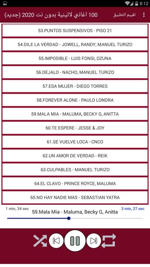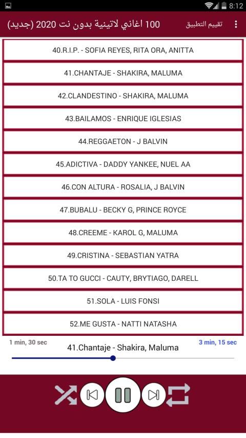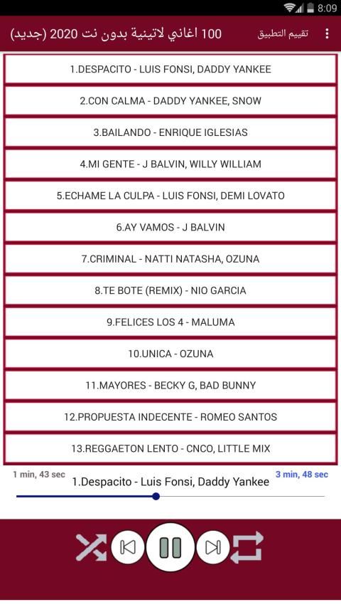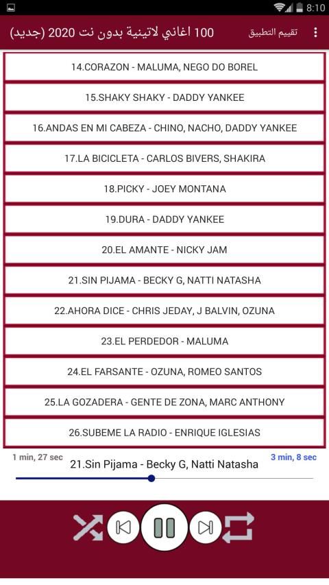 The application contains the Latin and Spanish songs the latest and most famous for many of the international Latin artists such as Maloma and Shakira and Ji Balfn and Enrique Iglesias and Luis Funci and Daddy Yankee .. It also contains the songs of many of the emerging and successful artists such as Becky Ji Ozone, Nikki Yam, Senso, Bad Bonnie and many new Latin songs without Net in a small size and distinctive design.