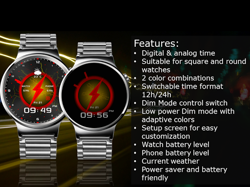 속도는 영웅 스타일의 현대적인 시계 얼굴입니다. Watchmaker가 디자인 한 안드로이드 착용을위한 현대적인 시계 얼굴, 그것은 날씨, 배터리 수준 및 2 색 옵션이있는 디지털 및 아날로그 시계 얼굴입니다. 중간에 플래시는 숨겨진 에너지를줍니다. 라운드 및 사각형 시계 모두.