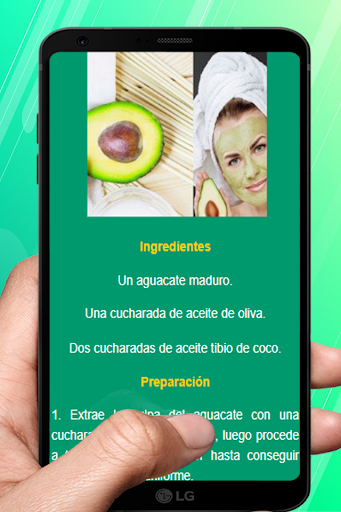 Esta app incluye más de 100 mascarillas caseras las cuales explica su preparación, modo de aplicación y en algunos casos indica la frecuencia de su uso para mejores resultados.