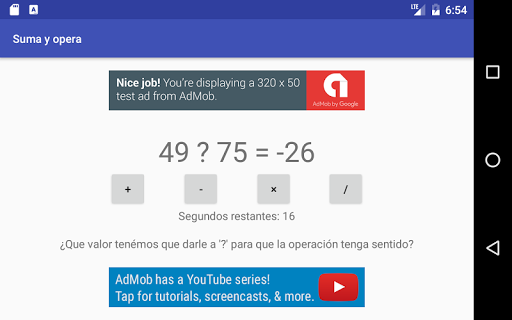 Our app has sums, subtracts, multiplications and even divisions. The system will generate an operation and you must to calculate that we have did to get this result. Will it be a subtraction? Or an division? Or may be a sum? And why not a multiplication?