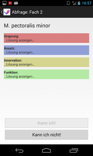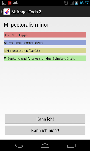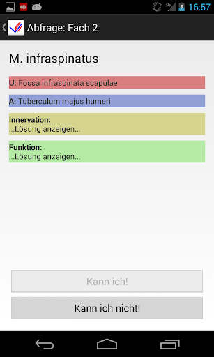 - Abfrage-Funktion: Ursprung, Ansatz, Funktion und Innervation kann man sich im beliebten Karteikasten-System abgetragen lassen.