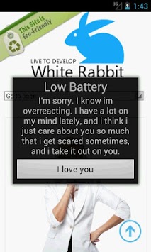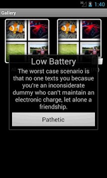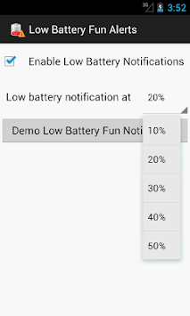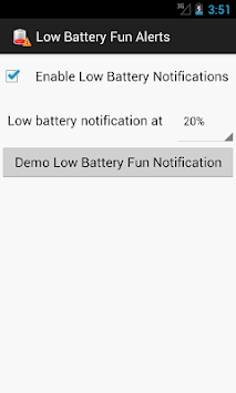 Did you know they say that 35% of all statistics are made up? Well one statistic that holds true is your battery! Don't you just hate when you see the dreaded low battery notification? We did too. So we set out on a path to turn our frowns :( upside down :) and came up with a great way to make you smile when you get your low battery notifications. With this app you will get a variety of witty and funny notifications that will be sure to put a smile on your face and give you a more friendly reminder that it's time to juice up your battery! We realized the demand for this and we filled it out right away.