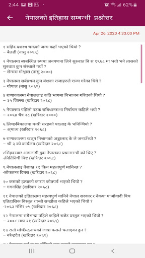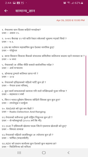 Loksewa Preparation App, In this App you will find Loksewa लोक सेवा related all gk and other question. This app is helpful to all level of loksewa students. This App is contain useful gk question for NASU,Kharidar,Engineering, Medical,Health and other loksewa exam in Nepal.You will get many questions answers about History, Geography, Literature, Sports and games, Science, Technology, Health, Nepali Culture, Religion, Interesting Facts and so many others important update which are very Important for loksewa Exam.