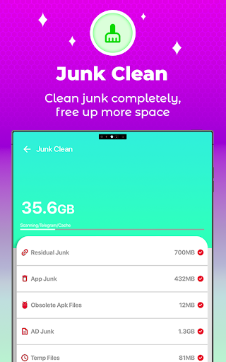 정크 파일을 제거하여 저장 공간을 해방시키는 효과적인 정크 클리너Temp 파일, 앱 캐시, 온도 파일, 전화기의 APK 파일.