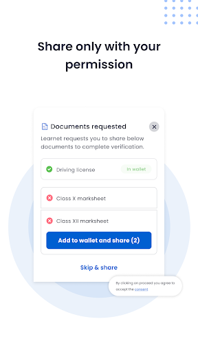 허가를받은 신뢰할 수있는 조직과 문서를 공유하십시오.대출이나 코스를 신청하려면 앱 내에서 공유 요청을 받게됩니다.요청을 승인하고 필요한 문서를 계속 추가하거나 공유 할 수 있습니다.