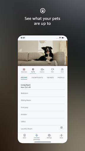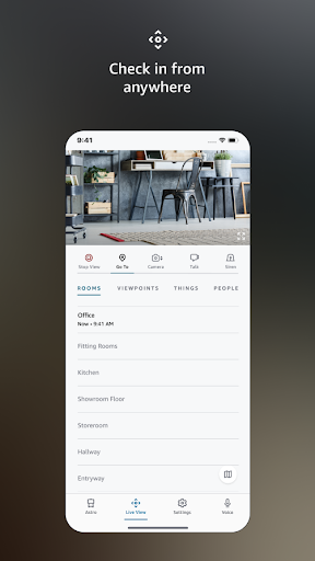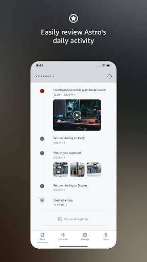 Astro 앱을 사용하면 공간과 라이브 시야를 볼 수 있습니다.특정 방, 사람 또는 물건을 체크인하십시오.설치하는 동안 Astro는 언제든지 앱에서 볼 수있는 공간지도를 배웁니다.Astro가 라이브 뷰를 시작하려는 곳을 탭한 다음 잠망경을 올리거나 낮추기 위해 더 나은 모습을 누르십시오.의심스러운 것을 보면 원격으로 사이렌을 사로 잡을 수 있습니다.