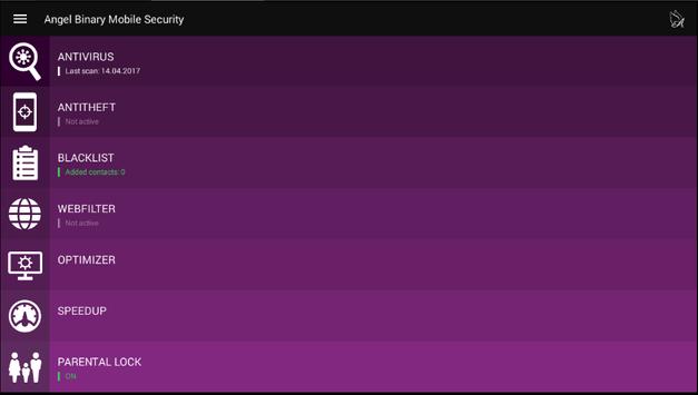 Angel Binary Mobile Security for Android – is easy to use product, with modern design and a lot of useful functions, reliable and efficient at the same time.