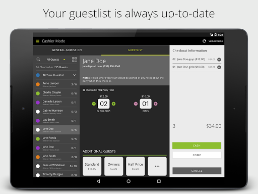 Your door will never run smoother. Easily toggle between Reservations, General Admission and Gueslist screens to accommodate every guest. You can even accept payment for both a guestlist party and walk-up guests in the same transaction.