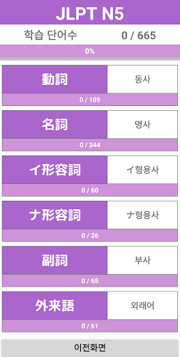 각 급수별로 동사, 명사, 형용사, 형용동사, 부사, 외래어 6개 파트로 단어가 나누어져 있습니다.