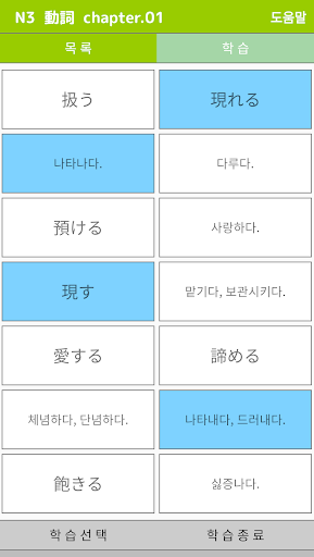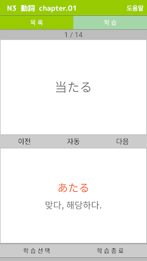 목록의 각 단어를 누르면 단어의 읽기와, 뜻을 표시합니다.