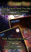 The Galaxy Clock is now available as a live motion wallpaper on your smart phone. Tap the middle of the clock to choose between 6 different cool galaxy theme high resolution images. This comes with Bonus Alarm clock feature as well You don't have to take my word for how awesome this application is, just listen to what some of my other countless thousands of users had to say about our first version "Choose Your Planet Clock LWP" Allison S "Planet rok This is the first planet themed wallpaper that I can choose my planet for each day of the week...nice work" Edward K "beautiful In one word, its beautiful. Live wallpaper and clock both in one. Using it happily." Raissa O "Wow I'm too happy to have it. Incredible live wallpaper. Recommended" And much much more!!! Finally an interactive live high resolution application that combines the use of a digital clock with live images of our most popular galaxies....Pretty impressive don't you think? This application is unique and there simply is no other application that combines that of a live clock and planet themed wallpapers INTO 1 APPLICATION....Best of all its FREE for all Android users! Simply tap your finger in the middle of the Galaxy to choose between 7 different themes based on the Galaxies throughout the cosmos. Of course we have a bonus feature addition as well just for you. Not only do we have 7 different planet themes for you to choose from, but we have added an ALARM CLOCK feature as well. Simple press a finger on the alarm clock icon on the top right above the Galaxy image and you can easily set your alarm clock as well. To set your Live motion alarm clock Galaxy theme wallpaper, simply do the following: SET WALLPAPER HOME SCREEN choose the option: LIVE WALLPAPERS Scroll until you find the app named Choose Your Galaxy Clock LWP Then simply SET WALLPAPER Thats it!!