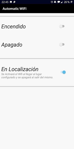 Automatic Wifi es una aplicación desarrollada para encender y apagar el WiFi de tu dispositivo diariamente utilizando Horarios o configurando una ubicación para que se encienda al llegar a el mismo y se apague al salir.