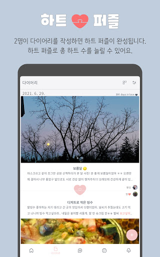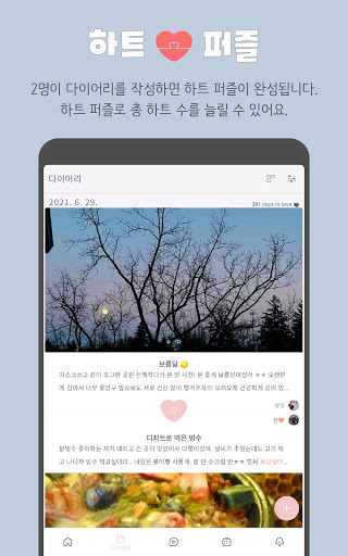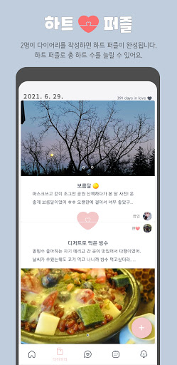 하루에 2개의 일기가 쌓이면 하트 퍼즐이 완성되며 하트 수가 추가됩니다. 총 하트 갯수는 홈 화면에서 만나볼 수도 있어요. 연인이 다이어리를 작성하지 않았을 경우엔 '재촉하기' 버튼을 눌러서 알림을 보낼 수 있습니다. 사진들과 함께 일과를 담아 일기장을 완성해보세요. 댓글을 통해 남자친구 / 여자친구와 소통할 수도 있어요. 함께 추억을 쌓을 컾 다이어리를 만들어보세요. 사진만 모아보는 앨범 형식의 '사진 모아보기'도 가능합니다.