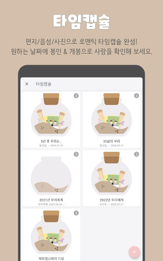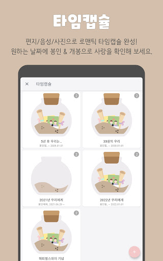 시간이 흐르고 꺼내볼 수 있는 타임캡슐입니다. 서로에게 남기는 글이나 사진들을 작성하고 선택한 시간에 타임캡슐을 봉인할 수 있어요. 봉인된 타임캡슐은 직접 선택한 개봉 날짜까지 열람이 불가능해요. 미래의 나 혹은 연인에게 마음을 보내보세요.