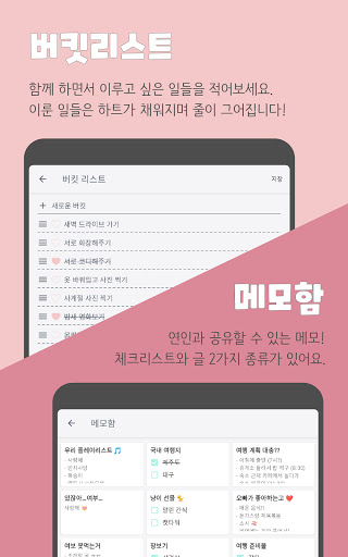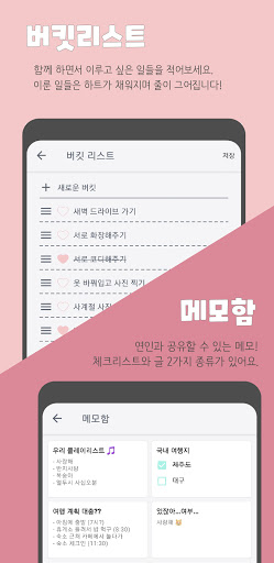 연인과 함께 커플 버킷리스트를 작성해보세요. 사귀는 동안 함께 이루어나갈 일들을 적을 수 있어요. 이미 이룬 일은 하트가 채워지면서 줄이 그어집니다.
