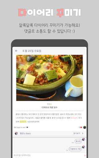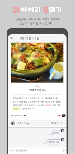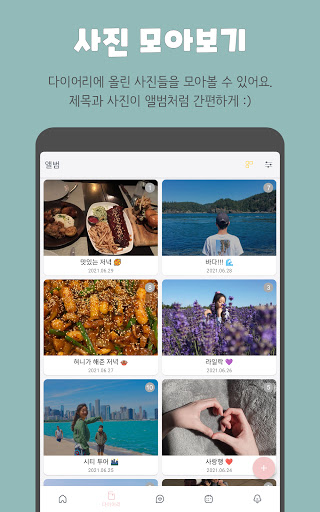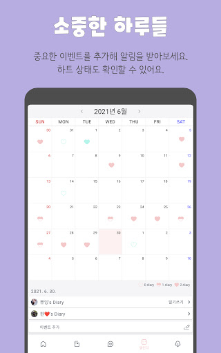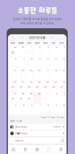 날짜별로 하트 상태(다이어리 여부)를 확인할 수 있어요. 중요한 이벤트들이 표시되고 새로 추가할 수 있습니다. 이벤트에 맞는 스티커를 골라보세요. 이벤트가 있는 날에는 하트가 민트 색깔로 변해요. 곧 다가오는 2개의 이벤트는 홈 화면에서도 디데이가 표시됩니다. 각종 기념일들을 만나보세요.