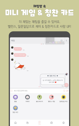 일상 속 대화들을 나누어보세요. 사소한 이야기부터 진지한 이야기까지 오직 둘만이 사용하는 비밀 채팅방입니다. 밸런스 게임과 일문일답, 그리고 칭찬 카드까지 모두 채팅방에서 즐겨볼 수 있어요. 미니 게임들로 몰랐던 연인의 취향을 알아볼 수도 칭찬 카드로 연인의 자존감을 높여줄 수도 있어요.