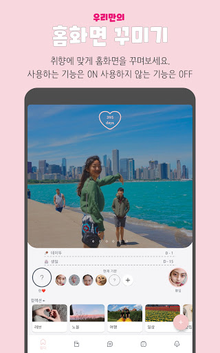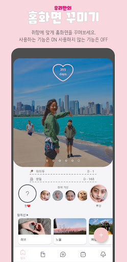 취향에 맞게 홈을 꾸밀 수 있어요. 자주 사용하는 기능은 홈에 표시하고 사용하지 않는 기능은 숨겨보세요. 사귄 날짜 계산기부터 컬렉션까지 변경할 수 있습니다. 커플 사진들로 우리만의 공간을 만들어보세요.