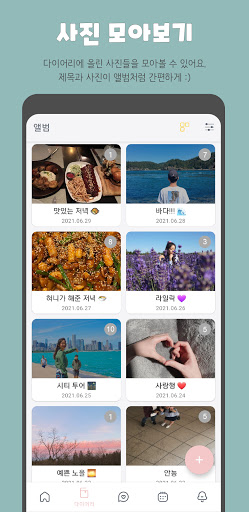 컬렉션을 만들어 일기를 주제별로 모아볼 수 있습니다. 즐겨찾기로 등록된 컬렉션들은 홈 화면에서 만나볼 수도 있어요.