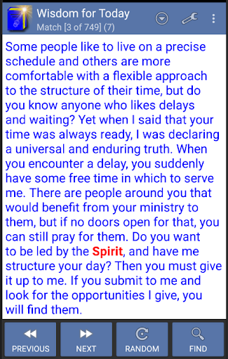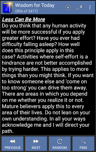 You can be reminded with notifications to read one or more random entries each day, or do a search to find wisdom on a topic of need or interest.