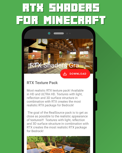 This application help you easily install RTX Shaders into your Minecraft PE game. With our 1-Tap Installer, you can easily download & activate RTX Shaders for Minecraft Pocket Edition into your smartphone or tablet in just a second! RTX Shaders details with screenshots also provide in this app to guide you how this mod works.
