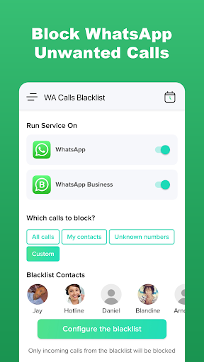 Call Blocker for WhatsApp can help you to blocks unwanted WhatsApp calls, private calls, unknown calls, anonymous calls, strangers, custom, etc. Our spam call blocker gives you the peace of mind you deserve!