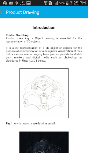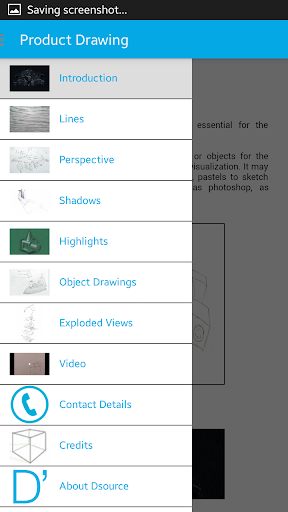 Product Drawing mobile app provides information related to representation of 3D objects. In this app, lines concept is meant for good sketching. Perspective is essential to be able to represent 3D objects with correct proportions. Shadows helps to make sketches popup from their backgrounds. Highlights concept are used to grab the attention. Exploded view is good to have an idea because as they come in handy while detailing out various parts of our product. Videos are also available in this app for effective learning. Note:-Mobile app contents are taken from http://www.dsource.in