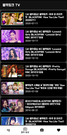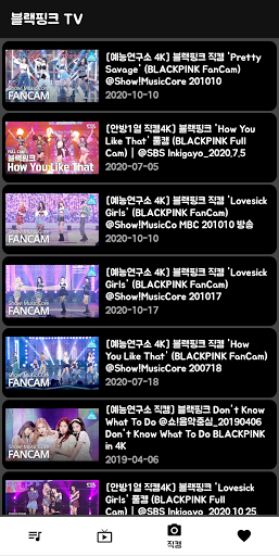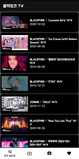여러가지 블랙핑크 음악 영상을 볼 수 있습니다. ■ 공식 뮤직비디오 ■ 한국 음악 방송 영상 ■ 직캠 영상