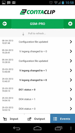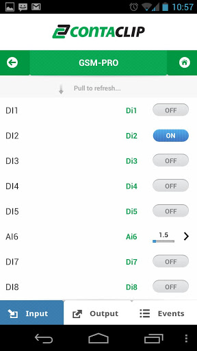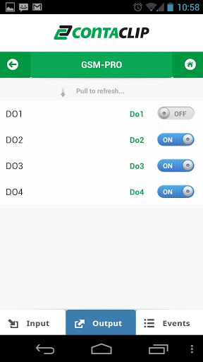 CONTA-CLIP‘s smartphone app for the GSM-PRO SMS relay provides a simple and fast solution to monitor and control one or more modules in the field. The app shows the status of all inputs and outputs of all connected GSM-PRO modules. Switch on your heater, fan or water pump simply by clicking a button. The app buttons provide intuitive control.