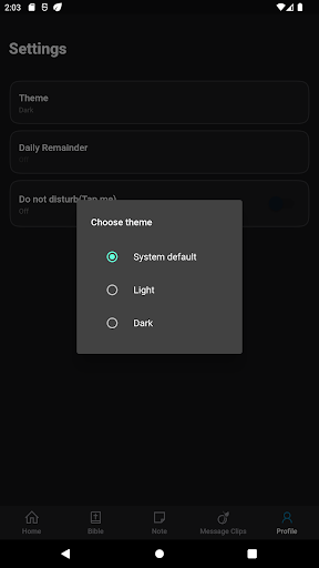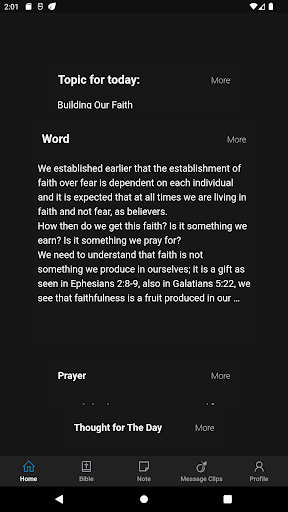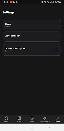 Secret Place creates a virtual digital environment for young people to have daily morning devotions undisturbed, void of other app's notifications thus helping them build a vibrant and blossom relationship with God. In addition to other existing features this version has authentication feature to enhance privacy of users, ability to persist saved notes across multiple devices, message clips, study plans, dark theme, bible-in-a-year feature and the calender feature to access past days writeups.