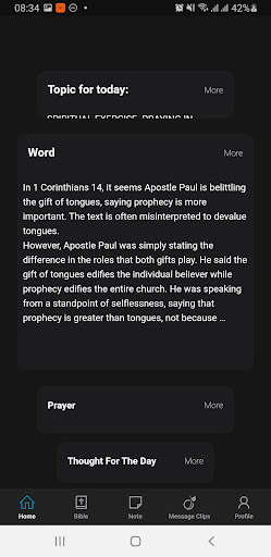 헌신은 향후 참고 문헌을 위해 북마크 할 수 있습니다.Google을 통해 가입하기로 선택한 사용자의 경우 Apple 또는 이메일이 여러 장치에서 메모에 액세스 할 수 있습니다.짧은 메시지 클립은 전체 메시지에 대한 링크를 사용하여 사용자 소비에 사용할 수 있습니다.다양한 주제, 주제 및 성경의 책에 대한 연구 계획도 제공됩니다.