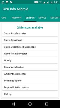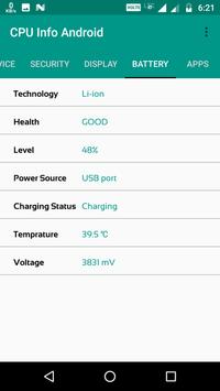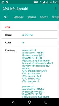 CPU info is a hardware specification app for Android with detailed information about your smartphone including CPU info,GPU info,Memory, Sensor,Device,Security,Display,Battery and info about installed apps.