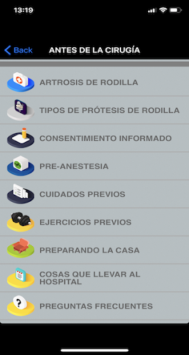 Se han incluido las principales escalas de valoración de artrosis de cadera y rodilla, que son esenciales a la hora de valorar su situación clínica tanto antes como después de la operación. Estas pueden ser fácilmente completadas por el paciente con varios clicks de pantalla y la aplicación calcula el resultado final, el cual puede ser enviado por email a su médico.
