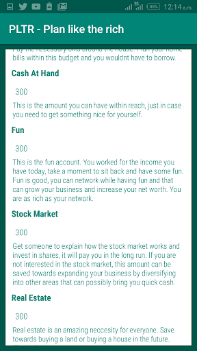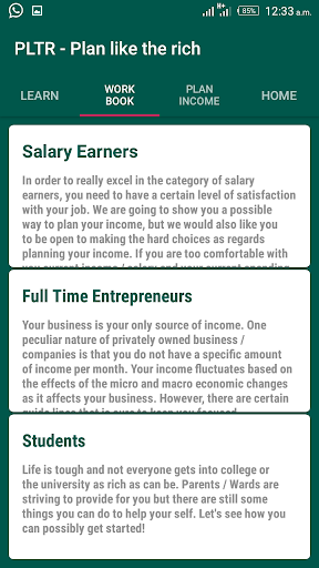 The traditional school, Robert Kiyosaki says, teaches you to get a job. Well, if you want to be rich, you need to learn about money instead. This app exposes you to ways and techniques for managing your current income and build your financial knowledge.