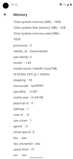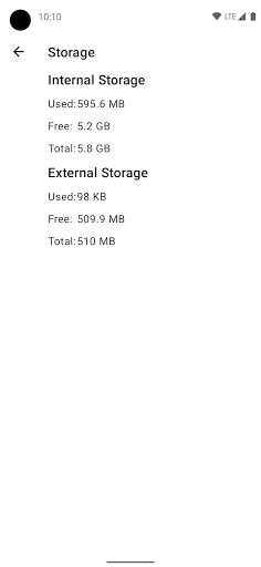 * Storage: Internal and External (if available) Total memory size, Used memory size, Free memory status