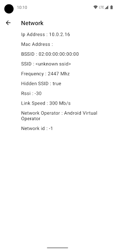 * Network: local ip address, wifi mac address, wifi bssid information, ssid information, wifi broadcast frequency value, privacy status of ssid, network speed, Rssi information, network name and network id