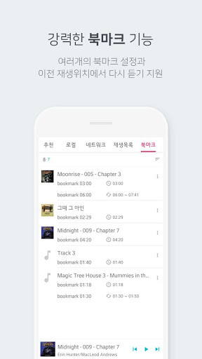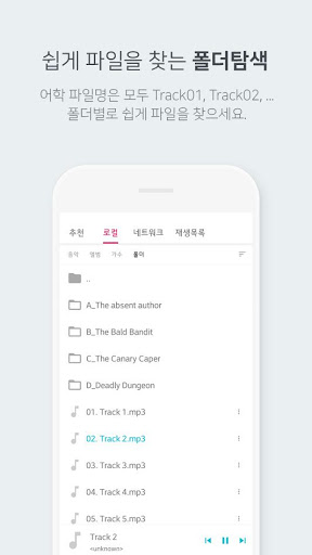 폴더 탐색, 구간반복, 배속 재생, 북마크, 수면 타이머 및 네트워크 파일 재생 기능을 제공합니다.