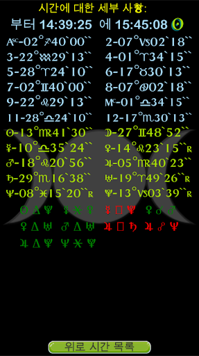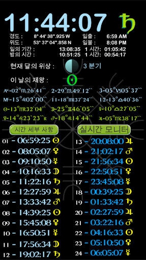 • 매일의 첫 시간은 Master of Day에 속하므로 일요일은 태양, 월요일은 달, 화요일은 화성, 수요일은 수성, 목요일은 목성, 토요일은 토성이므로 여기서부터 계산을 시작합니다. 전통적인 방법에 따라 사이클링을 진행하십시오.