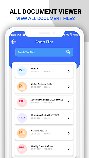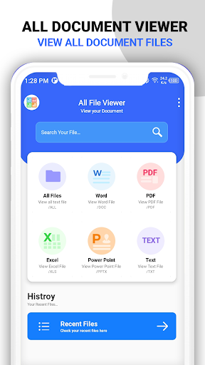모든 파일 판독기 또는 모든 문서 뷰어는 DOC 확장자 및 MS Office의 다른 모든 파일에서 PDF 파일이나 워드 파일을 읽는 문서 판독기 응용 프로그램입니다. 모든 파일 판독기는 모든 종류의 파일을 열 수있는 모든 파일 오프너 응용 프로그램입니다. Word 파일, PDF 파일, Excel 파일 및 PPT 파일을 볼 수 있습니다. 랩톱에서 문서 파일을 만들고 모바일에서 해당 파일을 읽으려면 모바일에서 MS Word 파일을 열 수 없습니다. 이 응용 프로그램을 사용하면 모든 파일 유형을보고 읽거나 읽을 수 있습니다.